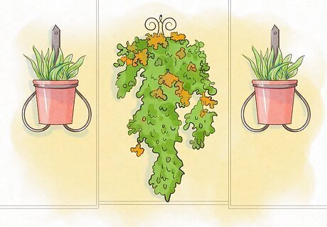 Place plants or branches along the walls. For an earthy or dramatic look, arrange branches above the windows or hang plants from the ceiling. Decide if you want plants that trail as they grow or if you'd like to hang small, potted plants on wall-mounted vases. Or, use high-quality faux plants and flowers. Plants can also introduce a pop of color into the dining room. If you want to use branches, leave them natural or paint them to stand out against your wall. For low-maintenance plants, suspend succulents from small containers or place them on shelves. Put large arrangements of flowers on your sideboard or in the center of your dining table.