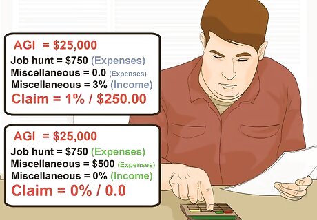 Calculate the amount of your expenses. You can't deduct all of your job hunting expenses. Instead, you can only deduct those that, when added up with your other miscellaneous deductions, total more than 2% of your adjusted gross income (AGI). For example, your adjusted gross income might be $25,000. Your job hunting expenses are $750 and you have no other miscellaneous expenses. In this situation, your total miscellaneous expenses are 3% of your income. You can't claim the first 2%, but you can claim the remaining 1%, or $250. If your AGI was $25,000 but your miscellaneous expenses were only $500, you couldn't claim any of your job hunting expenses.