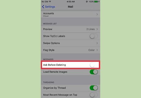 Slide the green Ask Before Deleting switch left to the "Off" position. It should turn grey. Now when you delete an email from the stock Mail app, it will be deleted immediately without going to the trash folder.