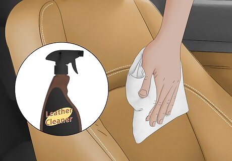 Use leather cleaner on leather parts. Use a cleaner designed specifically for use on leather when cleaning leather seats or upholstery inserts. This will prolong the life of the leather and prevent it from cracking. They make spray-on leather cleaner as well as pre-moistened wipes you can use to simply wipe the seats and trip components down. If you wish, you may also use a leather treater after cleaning the leather. This will condition the leather deeper and help it maintain its softness and shine longer.