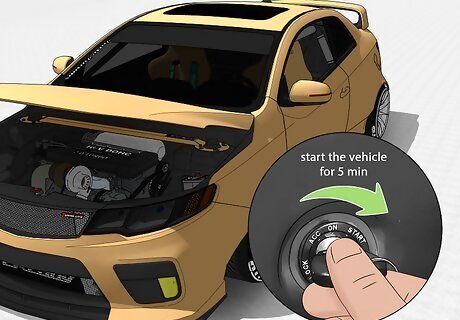 Warm the engine up for five minutes. Engine degreaser works best on a warm application. Start the vehicle and allow it to run for a few minutes to bring up the temperature of the engine block and other components. This will make removing stuck on grime significantly easier. Don’t leave the engine running for too long or it may get too hot to touch.