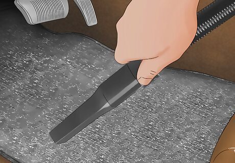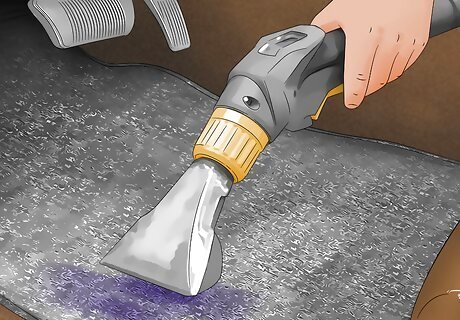 Vacuum the carpets. Either use a shop vacuum with a long hose or take your vehicle to an automotive vacuum center. Be sure to vacuum all of the carpeted surfaces in the vehicle, including the trunk and beneath the seats. If you take your vehicle to an automotive vacuum center (usually located with car washes) you will likely need quarters to pay for the vacuum. Keep an eye out for stains in the carpet you’ll need to address as you vacuum.