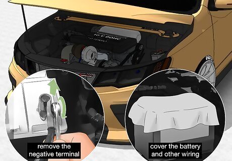 Disconnect the battery and cover exposed wiring. Use a hand or socket wrench of the appropriate size to loosen the nut holding the negative cable onto the battery terminal. Slide the cable off and tuck it down to the side of the battery. Then use some plastic bags and tape to cover the battery and any other loose bits of wiring you see in the engine compartment. While the engine likely won’t suffer any issues from getting wet, it’s better to protect electronics that could feasibly arc when reconnected. If there are any aftermarket wires in your engine bay for things like external amplifiers or subwoofers, make sure they are covered.