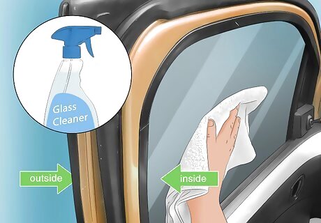 Wipe down interior and exterior glass. Use a glass cleaner to spray and wipe down all of the glass surfaces on the interior of the vehicle, including the inside of the windshield and the rear view mirror. Pay close attention to wipe away any streaks or fingerprints. You should wash the exterior of the windows with glass cleaner after washing the car to ensure there are no water spots.