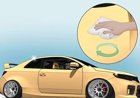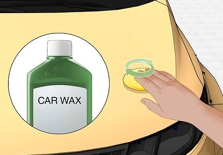 Once the vehicle is dry, apply a coat of wax. You can use a towel to dry the vehicle, or you may choose to allow it to air dry. Once the vehicle is dry, use the applicator sponge that comes with automotive wax to apply a fresh coat to the painted metal portions of the exterior of your vehicle. Even if you use a towel, you will need to wait until the water dries in the small crevices all around the vehicle before you wax. Apply the wax to the entire body of the vehicle, then give it time to dry.