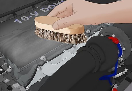 Use a brush to scrub stuck on grime. Use a stiff bristled brush to scrub large deposits of stuck on dirt or grime in your engine while the degreaser works. It should loosen the grime, allowing you to remove it with the brush. Be extremely careful not to burn yourself or breath the fumes in too deeply. It’s best to use engine degreaser in open, well ventilated areas. Remember that the engine is hot, so avoid touching it directly with your hands.
