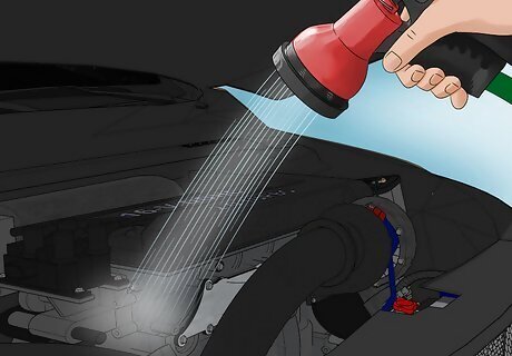 Rinse the engine with a hose. Use a hose to rinse the engine degreaser and all of the grime off of the engine. After you finish rinsing it, look around for areas that you may need to apply degreaser to again. Repeat the process if necessary. If certain parts of the engine are still dirty, apply the degreaser again and repeat the process. Plastic that still looks dirty can be cleaned with an all-purpose cleaner.