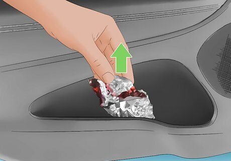 Clean out trash and personal items. Before you can do a thorough job of cleaning out the vehicle’s interior, you’ll need to remove any loose trash from the cabin. If you have personal items like blankets, spare pairs of shoes or the like, you should remove them as well. Use a trash bag to collect scraps, loose wrappers, or any other trash from the floor, seats or ashtrays in the vehicle. Collect your personal items and set them aside to bring inside. Don’t forget to clean any trash or personal items out of the trunk as well.