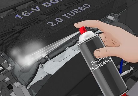 Apply engine degreaser. Spray the engine degreaser directly onto the metal portions of the engine and cylinder head. If some of it over-sprays onto plastic components that’s all right, but try to avoid getting it on painted surfaces as it may damage paint. Read the instructions on the specific type of engine degreaser you purchased to know how long to let it sit. The longer you let the degreaser set (within reason) the deeper it will clean.