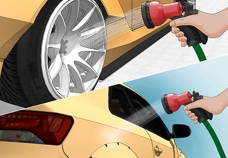 Rinse the car with clean water. Use a hose to rinse the wheel and tire cleaners off, then rinse the rest of the car in its entirety. If there are any leaves or other debris on the car, you may want to remove them by hand before continuing to rinse the body. A lot of the dirt and road sludge should come off of the car as you rinse it. A high pressure nozzle will help get more of the tough to clean dirt off of the vehicle.