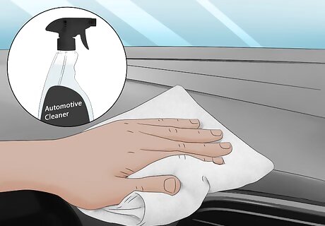 Wipe down plastic surfaces with interior cleaner. Use an automotive interior cleaner to wipe down all plastic trim components in the interior of your vehicle. If you don’t have automotive cleaner, an all purpose cleaner will also suffice for wiping away dust or any stuck on grime. Don’t use all purpose or interior cleaner on leather. Make sure to wipe in the nooks and crannies of the dashboard where dust tends to collect. You can purchase interior cleaners at most automotive and large retail stores.