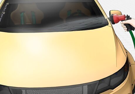 Rinse the entire vehicle. Once you have washed the entire body of the vehicle, rinse it thoroughly to ensure no soap can remain and dry on the paint. Just as you did with soaping it up, start rinsing at the top and ensure all the soap has been washed away before moving lower. Soap can dry onto paint, causing it to look duller. Removing dried soap can remove wax and even damage clearcoat.