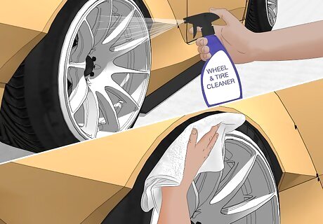 Apply wheel and tire cleaner. Before washing the body of the car, apply tire and wheel cleaners to your tires and rims. You may choose to buy a combination tire and wheel cleaner to minimize the steps, or you may choose to purchase cleaners for each portion of the wheel. Allow the cleaner to set for a while and scrub away brake dust or stuck on grime with a soft bristled brush and a rag. Make sure to use a sponge or rag that you do not intend to use washing the body of the vehicle. Allow the cleaner to sit for a few minutes on the wheels and tires before spraying them off.