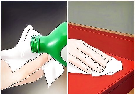 Disinfect all materials. After you have washed all toys and dishes with clean soapy water, you should use a disinfectant on the toys. It is not necessary (or advisable) to use a disinfectant on food and water dishes. For the toys and the cage, choose a disinfectant carefully. You want a product that is strong enough to kill germs, but safe for your pet. It is a good idea to ask your vet for a recommendation. If you cannot find a suitable product, you can make your own disinfectant. Make a bleach solution of 1/2 cup bleach to 1 gallon of water. Apply this solution to all items that your hamster uses. After disinfecting everything, rinse with water. Thoroughly dry all toys and accessories with paper towels or clean cloths.