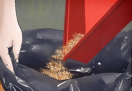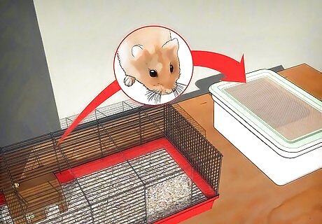 Get rid of old materials. Once you have safely relocated your hamster, you need to remove old materials from the main cage. Your hamster cage should have a good supply of bedding material. Popular choices are paper, pellets, or alfalfa shavings. Empty all of the soiled bedding into the trash. Empty the food and water containers, too.