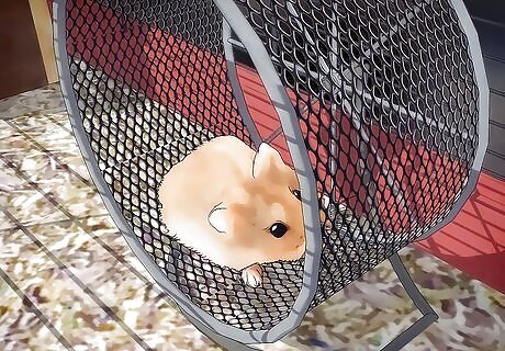 Let him exercise. Hamsters like to move around. Equip his cage with a wheel for him to run on. You can also take your hamster out of the cage occasionally so that he can roam around. Always supervise your hamster when he is out of the cage. Do not let him scurry under furniture or out the door.