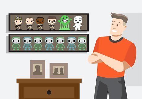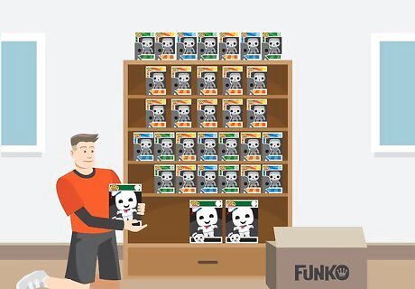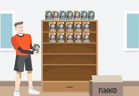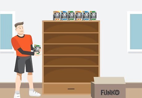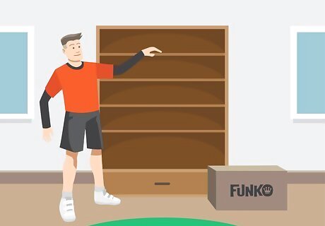Set up your bookcase in a prominent, well-seen location. Look around your home to see if there are any bookcases you could repurpose. If there’s no extra furniture lying around, consider purchasing or building a new bookcase to display your figures. If you want any guests and visitors to admire your Funko Pops, consider setting up the bookcase in your living room. When purchasing a bookcase, opt for a model with adjustable shelves. This makes it easier to arrange your Funko Pops while they’re still boxed. If you’d like your Funko collection to be private, consider keeping it in your bedroom.