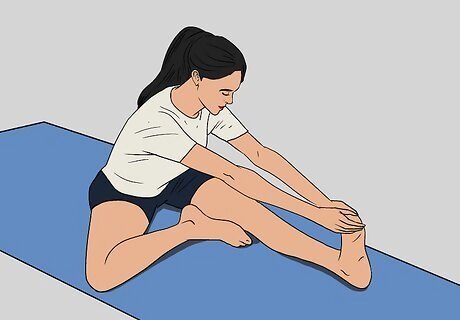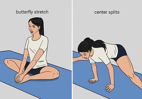 Stretch for the pas de chat using the butterfly stretch and center splits. These stretches improve flexibility in your inner thighs, which is required for the pas de chat. To do the butterfly, sit on the floor and bend your knees so that your soles are touching. Pull your feet toward your body as close as you can. If the stretch feels too easy, pull your feet closer or lean your body forward. To do the center splits, start in a standing position with your feet apart. Now slide them sideways as far as you can. Hold the stretch for 2-3 minutes or until you start feeling pain.