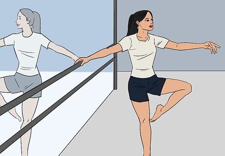 Practice doing passes at the bar and in the center. This is because you will be forming two passes in the air during your pas de chat. To do a passe, start in fifth position. You can actually pick any of the five, but pas de chat is most commonly done in fifth. Now slide up one leg on the front of your other one till you form the same number four you did lying down in the last step. Hold the position and slide the leg back down to your starting position. Repeat with both legs.