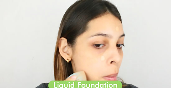 Use a liquid foundation that matches your skin tone. Use your fingers or a sponge to gently cover your face in foundation. Be sure to go beneath your chin to your neck. Make sure the foundation is applied in an even, thin coat. To match your foundation, visit your local pharmacy or makeup supply store to test out some products. Don't wear makeup while you're testing! Rub a small amount of foundation onto your jawline. If it blends in perfectly, that's your shade. If you're struggling to find the right match, you may need to get two foundations (one lighter and one darker) to mix your own custom shade. If your face appears chalky after you've put on your foundation, you're using a product that's too light for your coloring.