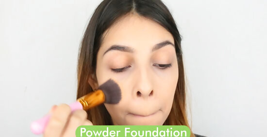 Apply a powder foundation to set the makeup. Use a large face brush to gently cover your whole face in the powder. This will keep your glamorous Bollywood makeup looking fresh all day! Your powder foundation should also match your skin tone. Be sure to use a product that blends into your skin rather than making you look either chalky or orange.