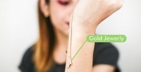 Add some gold jewelry to your look. Gold jewelry is another hallmark of Bollywood films, so consider adding a gold necklace or earrings to complete your look. For more traditional pieces, go for a headpiece or handpiece. However, as with bindis, be sure to avoid treating these accessories like they're part of a costume.