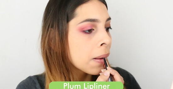Start with a plum-colored liner for a more dramatic lip. Go all around the edges of your lips. Then use the liner to fill in your lips, as this will help the lipstick really pop. Gently blend the liner with your finger.