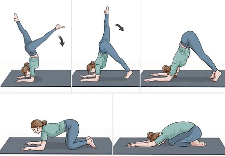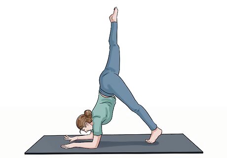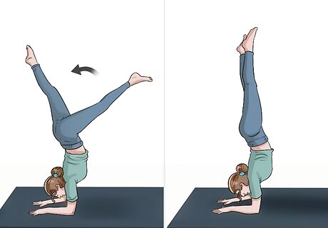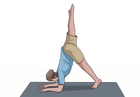 Perform a one-legged Dolphin pose (Ardha Pīñcha Mayūrāsana) with kicks. From the Forearm Plank pose, walk your feet towards your elbows until your bum and hips are pointing into the air. Lift your right leg up as high as it will go, while keeping it straight and your foot flexed. Push up off the ground with your left foot and kick your right leg even further upwards and forwards. Keep your left leg pointed down and only lift your left foot off the ground a short distance. Repeat a few times, then switch legs. The purpose of this pose is to practice keeping your balance as you bounce up off your feet.