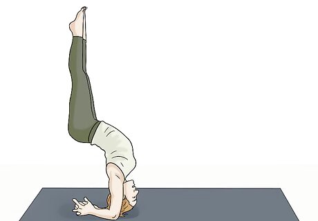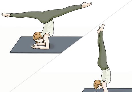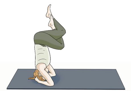 Add Eagle Legs (Garuḍāsana) to your Headless Headstand. While in the Headless Headstand pose, bend your left leg slightly. Bend your right leg at a 90-degree angle and cross it over your left leg. If you’re feeling really adventurous, bend both legs so that your lower legs are parallel to the floor, while your right leg is still crossed over your left. Once you’ve done Eagle Legs in one direction, switch legs and try it again.