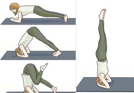 Add shoulder dips to your Forearm Plank pose. While in the Forearm Plank pose, push yourself forward with your toes and forearms. This will move your head (which should be looking at the ground) forward and down. Then move back into the Forearm Plank position. Repeat these dips 5 to 10 times, rest, then do another set of dips. Create a daily yoga routine using these poses to build your strength over time. There is no rule as to how many reps or days of these poses you’ll need to do before you’re ready–it’s up to you to determine when you feel ready.