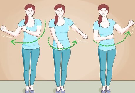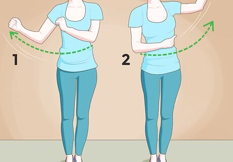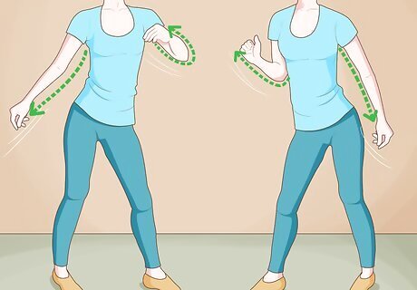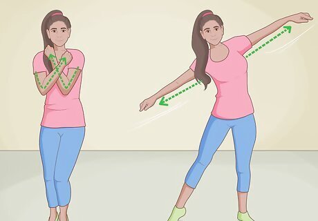 Swing your arms back and forth. Start by pushing both arms straight out in front of you, then swing them around and up to the right. Your right elbow should be bent at a 90 degree angle with your hand pointing at the ceiling. Your left arm should be bent in front of your chest. Snap using both hands. Repeat the swinging motion, to the left this time. Snap.