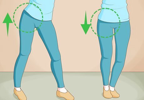 Push your hips up and down while you step-touch. Now it's time to add some hip motion. Push your hips up to the left when you step to the right. Bring your hips down when you bring your left foot in for the touch. Then, push your hips up to the right when you step to the left. Bring your hips down again when the right foot touches. Repeat. Try making this motion very smooth. It should look almost like you’re swaying back and forth.