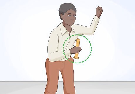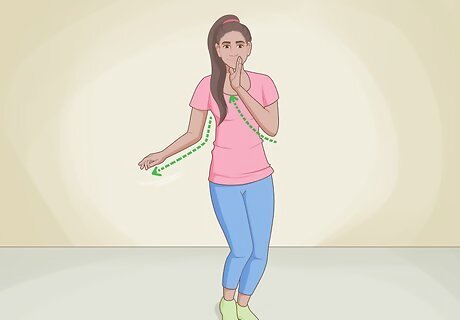 Pause and wave your hand in front of your face. Time this move to the lyric "I wanna die" at the end of the first verse. Stop step-touching, stand with your feet about hip-width apart, and bend your left arm so your hand is in front of your face. Then, wiggle your hand quickly back and forth as you bring it down, while simultaneously bending your knees. Jump back into the basic steps once Tom Jones has finished singing the line "I wanna die."