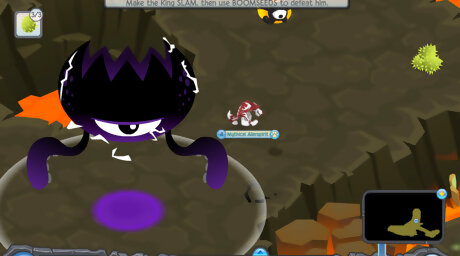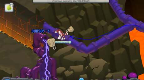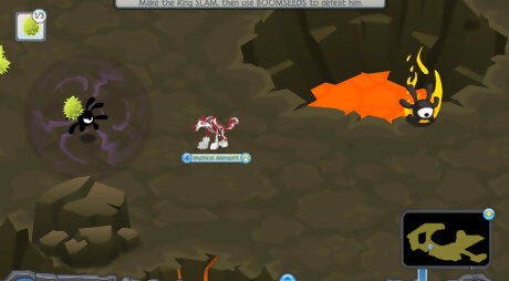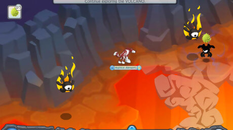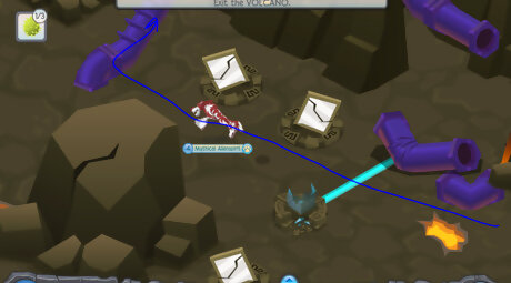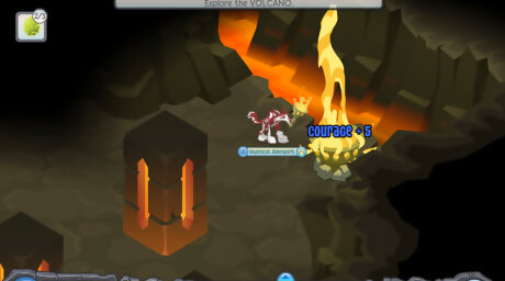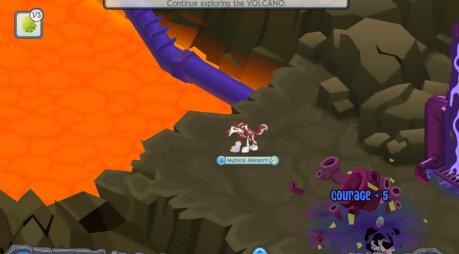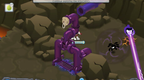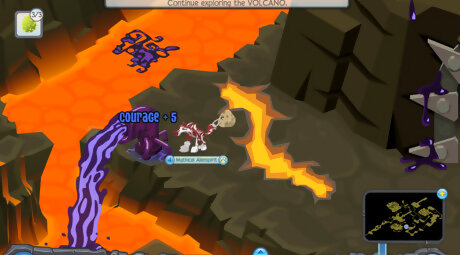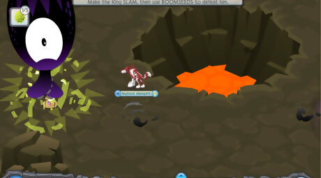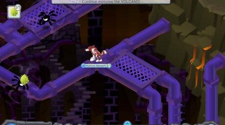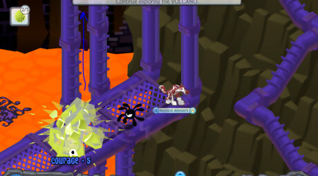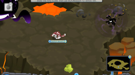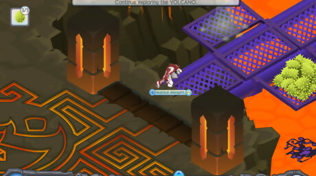 Destroy the phantom sprouters. As you continue along the wide rock path, several phantoms and sprouters will appear, as well as normal wandering phantoms - destroy them quickly. The path will move down then left. Destroy sprouters along the way as well as phantoms you encounter. Try destroying the sprouters as the first phantom appears so you can destroy both of them at once with one boomseed. Otherwise, you'll use more boomseeds than you really need to and you'll have to keep going back to the boomseed pile again and again. For a more effective way of destroying phantom sprouters, use your arrow keys to move while you hold a boomseed at the ready just in case with your mouse. This way, even while you're moving, you can hold a boomseed in the direction of where the phantom sprouters will be and drop them quickly so that can you destroy them faster and increase your chances of destroying it before a phantom even emerges and lessens your chance of being put to sleep. Advance.png If you want more courage, try luring out all the phantoms in the sprouter and kill them all while you're out of their range, such as behind a rock so the phantoms can't get to you. Do this for as long as you want or until the sprouter stops spawning phantoms. Better.png Continue along the wide stone pathway down and then left. Again, destroy phantom sprouters along the way. Destroy two more phantom sprouters and then go down the purple tube. Encounter a platform with another phantom sprouter and then go down the purple tube. Reach the heat platforms. Paathway.png