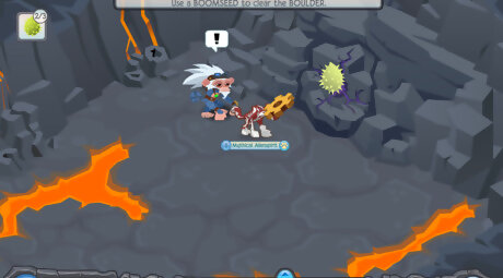 Enter the volcano. Destroy the boulder with a boomseed and enter the volcano.
