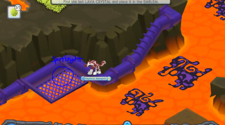 Find the fourth lava crystal. Go back to the platform you found the second crystal in. Once again, go down the tube at the bottom of this platform that you went along to grab the second crystal. Now, grab the spotbright you should have seen earlier as you did so. Put it into the one broken machine around the left of the platform. Another complicated puzzle must be solved to light the one crystal that will unlock the gate. This gate will reveal the final cork which must be used to obtain the fourth and final crystal. Notice that unlike easy mode, all mirrors are adjustable. Solve the mirror puzzle. Click the machine three times. Click the mirror next to it three times. Then click the mirror the light reflects to two times. Click the mirror beside that one three times. Click the mirror ahead of that one twice. Click the mirror to the right of that one twice, and then click the mirror the light reflects to twice as well. If needed, use the image for reference. Screen Shot 2020 02 02 at 8.18.52 AM.png Click the mirror right of the one you just adjusted twice, and click the mirror the light reaches three times. Click the one beside that one twice. Click the mirror the light reflects to three times and finally, click the last mirror twice. The crystal will light and the gate will unlock, revealing the last cork you'll need to grab the final crystal. Screen Shot 2020 02 02 at 8.19.24 AM.png Get the lava crystal. Get back to the main platform and go all the way to the bottom left. Plug in the phantom pipe, go through the unblocked tube, and grab the fourth lava crystal. Place it into the emblem. Crystal4.png