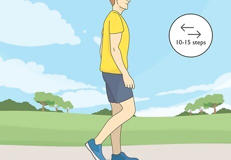 Start walking. Take 10-15 steps in one direction while breathing normally. Pause after you have finished your steps and then breathe again. Take as long as you like. Once you are finished breathing, take 10-15 steps in the opposite direction. Pause and breather again. Continue this pattern for at least 10 minutes. If counting the number of steps you are taking is distracting, pick a defined point on the path where you will turn around. You can also meditate by walking in a straight path. Do not feel obligated to pace back and forth as you meditate.