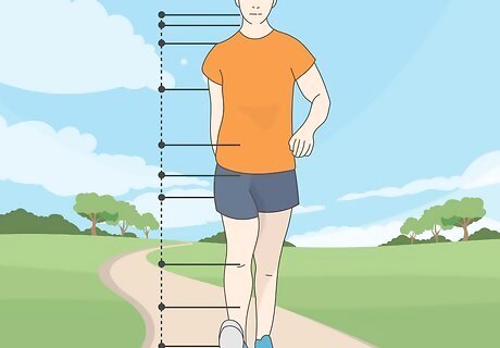 Be aware of your body. Start with the part of your body that is closest to the ground and work your way up. Begin with your feet and then move to your ankles, to your shins, your calves, your knees, your hips, your pelvis, your spine, your stomach, your shoulders, your arms, your neck, and then lastly your jaw. Being aware of your body does not involve any thinking per se. Instead you are noticing the different sensations and how your body is moving. Notice how your feet feel touching the ground. Notice how your muscles contract as you take a step. What kind of sensations are you experiencing in each part of your body? Do you feel your clothing touch your knees or your stomach as you take a step? How does your hip change positions as you lift your leg up or put your leg down? Notice how your arms and shoulders swing as you walk.