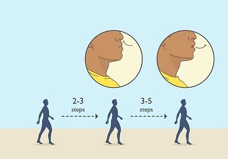 Combine your breathing and steps. Walking meditation helps create unity between your body and your mind. Breathe in as you take two or three steps. Then breath out and take three, four, or five steps. Modify the amount of steps you take with each breath. Find what is comfortable for you. No matter what breathing pattern you use, your breathing should remain slow and relaxed. It may take a few times before you find your breathing and walking rhythm. Avoid holding your breath as you are walking. Also, if you find yourself getting out of breath, inhale and exhale more frequently.