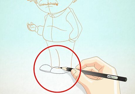 Inside the mid-body section draw a line as shown. The line should be lined up with the vertical line previously drawn for the head. Alongside this line on the right side draw three small circles to represent the buttons of the coat. For the collar, draw a 'W' shape right beneath the head with the center of the 'W' aligned with the line in the coat. At the end of each arm, simply draw one circle for the hand to the left to represent the palm of that hand. Now, draw the fingers using simple oval shapes.