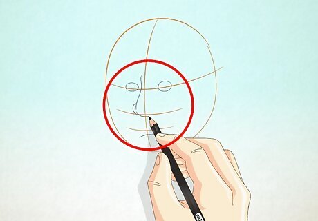 Along the horizontal line, draw two circles. Inside both circles draw a large dot to serve as the eyes. Make sure to draw the eyes proportionate to the head. Between the eyes and along the vertical line draw an oval shape with an opening near the top right corner to form the nose. Once again, make sure to keep it in proportion with the head.