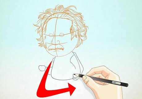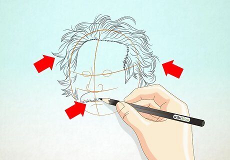 Now that the basic face is done, add the hair. Simply give him two bushy eyebrows that cover about a third of each eye. Make them smooth on the bottom and wavy up on top as shown. Give him a considerably large mustache right beneath the nose starting at the horizontal line of the initial circle. Draw the mustache smooth at the top and wavy on the bottom. For the actual hair, draw out a shaggy outline around the upper half of the head and along the sides, bringing it back up on the right side and over and above his eyebrows to form the bangs.
