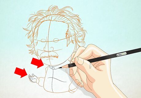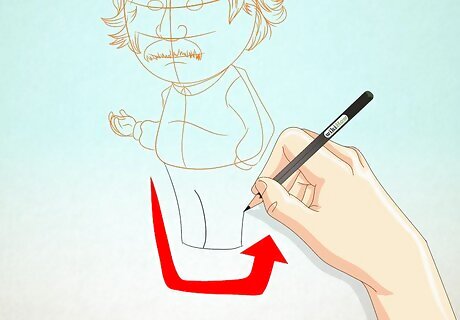 Underneath the head, draw out a trapezoid to form the mid-body section. Then draw two incomplete rectangles with rounded corners to form the arms. Have the right arm facing down, following the form of his body. The one on the left should be facing up and outward at an angle.