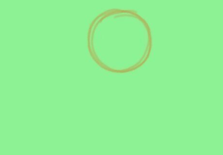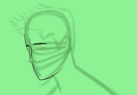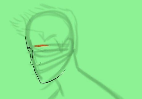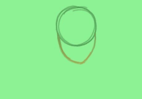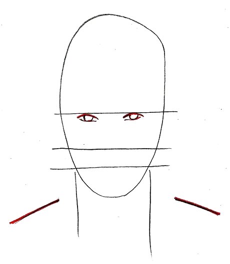 Draw his eyes directly below the highest guideline. Then, add two lines for his shoulders.