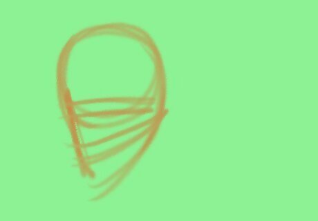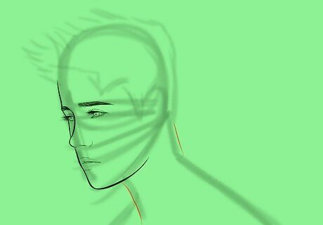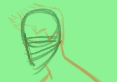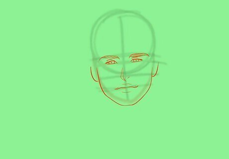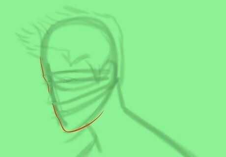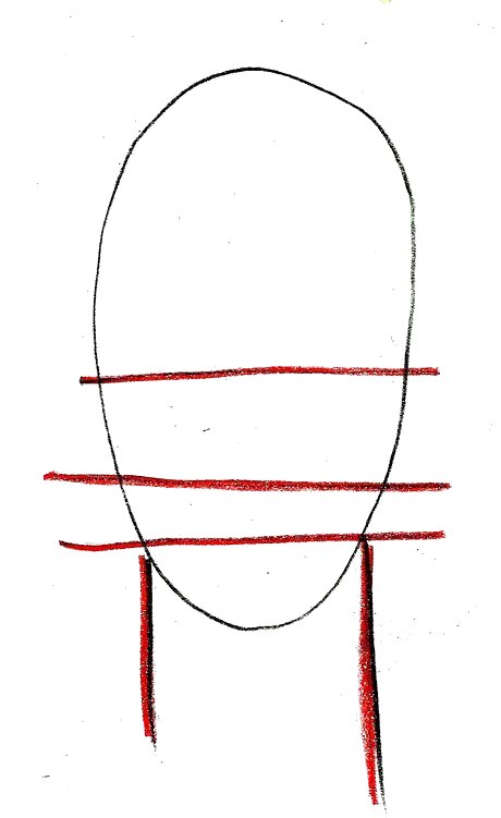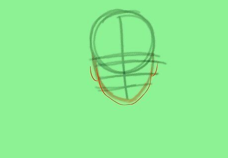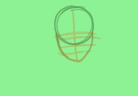 Add guidelines. Draw one halfway down the face, three quarters of the way down the face, and 7/8 of the way down the face. Also draw two lines for the neck.