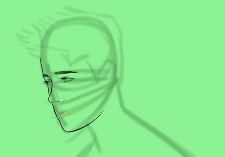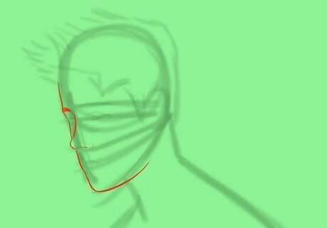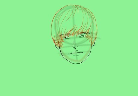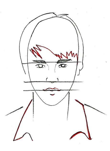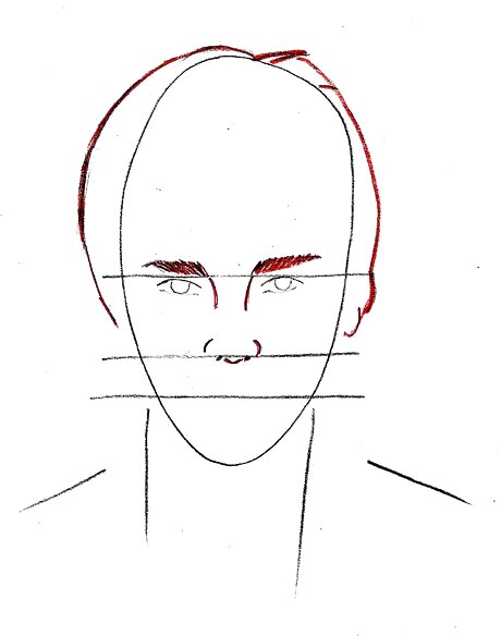 Outline his hair. Draw the nose, beginning at the second guideline. Finally, draw eyebrows just above the first guideline.