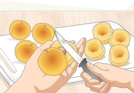 Cut the apricots into halves or quarters to get rid of the pit. Place the blade of a serrated knife on top of the apricot so it goes through the middle of the fruit. Push the blade into the fruit until you feel it hit the seed inside. Rotate the apricot in your hand to cut all the way around the fruit. Twist the 2 halves of the apricot to separate them before popping the seed out with your knife. You may either use the apricot halves or cut them again into smaller quarters. Use your finger to push the pit out from the fruit. You do not need to remove the apricot skin since it’s edible. Avoid using a knife with a flat edge since you could make the blade dull.Warning: Apricot pots are toxic if ingested, so make sure you remove them completely from the fruits.