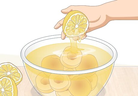 Soak the apricots in lemon juice and water to prevent discoloration. Fill a large mixing bowl with equal parts of lemon juice and cold water and stir them together. Put the apricot pieces into the bowl and leave them to soak for 5 minutes in the solution. Strain the liquid out from the bowl and set the apricots on paper towels to remove the excess liquid. The lemon juice solution preserves the color of the apricots and prevents vitamin and mineral loss. You don’t need to soak the apricots beforehand if you don’t want to.