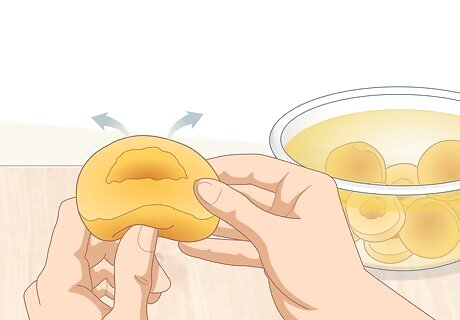 Turn the apricot pieces inside out to help them dry better. Hold an apricot piece by the cut edges so your thumb presses against the skin side of the fruit. Push the apricot’s skin forward to expose more of the fleshy interior to the air. Continue turning the rest of the pieces inside out the same way.