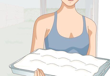 Cover the fruit with cheesecloth to protect it from bugs. Get a piece of cheesecloth that’s large enough to cover the top of the tray and wrap around the bottom edges. Pull the cheesecloth tightly on top of the wire rack so it covers the fruit, and secure it to the bottom of the tray with masking tape. Leave the cheesecloth on the fruit the during the entire drying process so bugs and pests don’t eat the fruit. Buy cheesecloth at kitchen supply stores or online. You may also use a piece of muslin if you aren’t able to get cheesecloth.